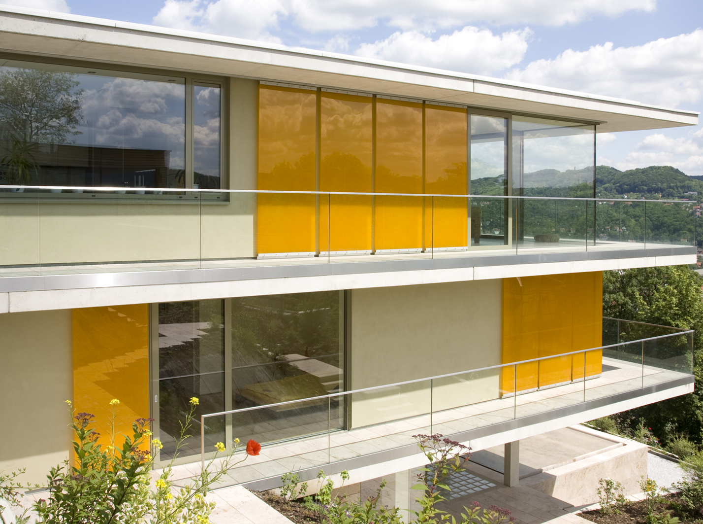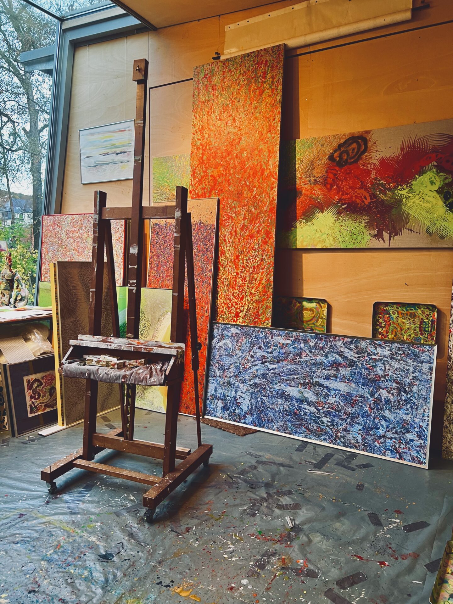 Architektur ist für mich eine begehbare Skulptur aus Licht, Proportion, Blickachsen und dem Bezug zur Natur. Innenräume werden zu Begegnungsräumen, Fenster sind gerahmte Bilder und ihre Ausblicke Teil der Gestaltung. Wie das aussehen kann, wird an Architekturprojekten, wie dem Hotel Scala in Jena, dem Atelier Bärenwald oder meinem selbst entworfenen Wohnhaus deutlich, bei denen Innen- und Außenraum aufeinander Bezug nehmen. Meine abstrakten Malereien auf langen schlanken Formaten entstehen genau aus diesen Erfahrungen heraus: Lange Fensterformate sind meist decken- und raumhoch gestaltet und rahmen den Blick nach draußen immer wieder neu. Aktuell arbeite ich an Filzbahnen, die zugleich Vorhang, Wandfläche, Raumelement und Raumteiler sind und zusätzlich als schallabsorbierende Elemente wirken. Gerade an den Übergängen zwischen Disziplinen entstehen neue Ausdrucksformen und auch neue Märkte.