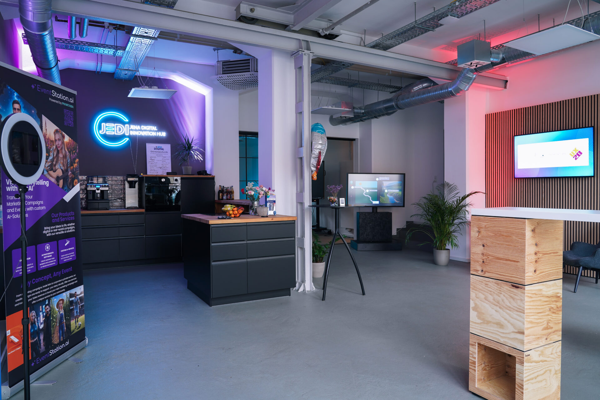 Die flexiblen Räume bieten Platz für Workshops, Meet-ups und Hackathons. Hier treffen Fachleute, Unternehmen und Studierende aufeinander, um Netzwerke zu knüpfen und digitale Lösungen zu entwickeln. Als de:hub für Photonics & Digital Experience Platforms unterstützt der JEDI gezielt Start-ups. Zudem entstehen hier über das Modellprojekt Smart City innovative Lösungen für Jena. Ein Schwerpunkt liegt auf digitaler Bildung: Kinder, Jugendliche und Studierende können hier ihre Kompetenzen ausbauen.