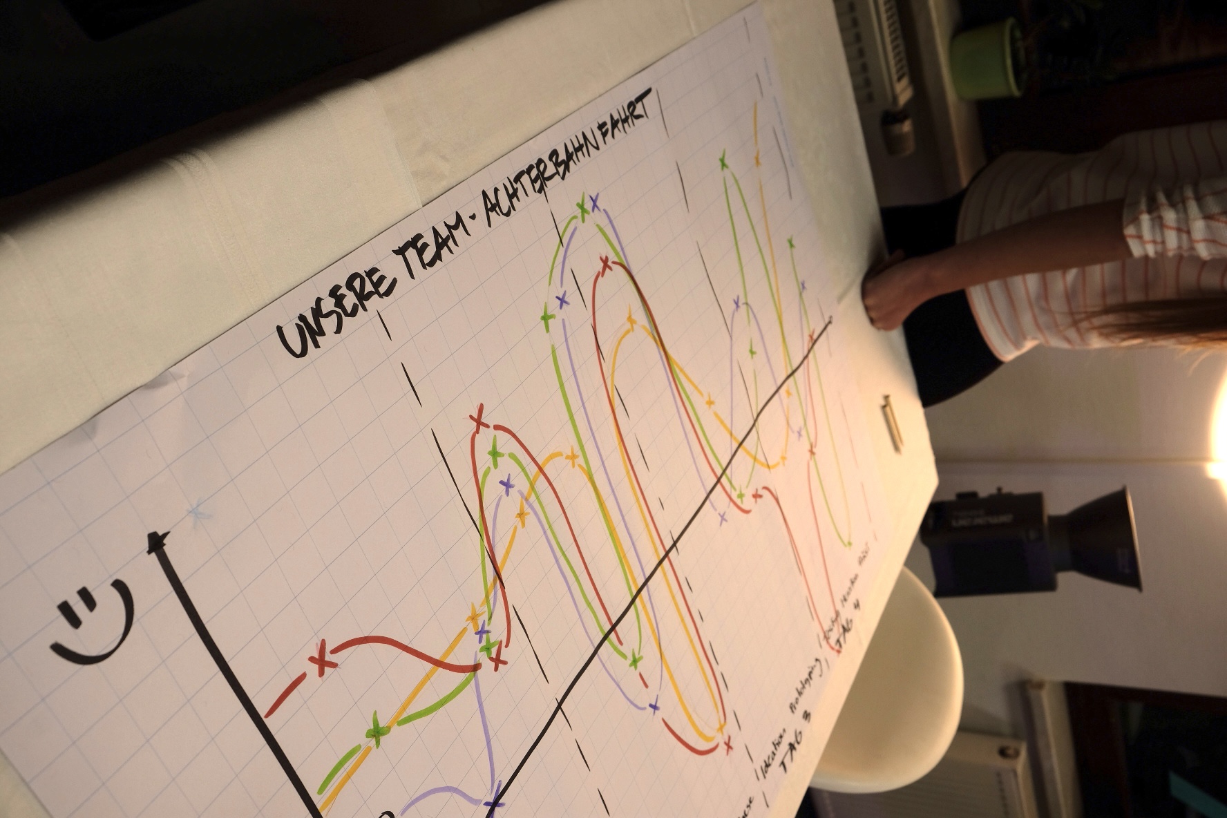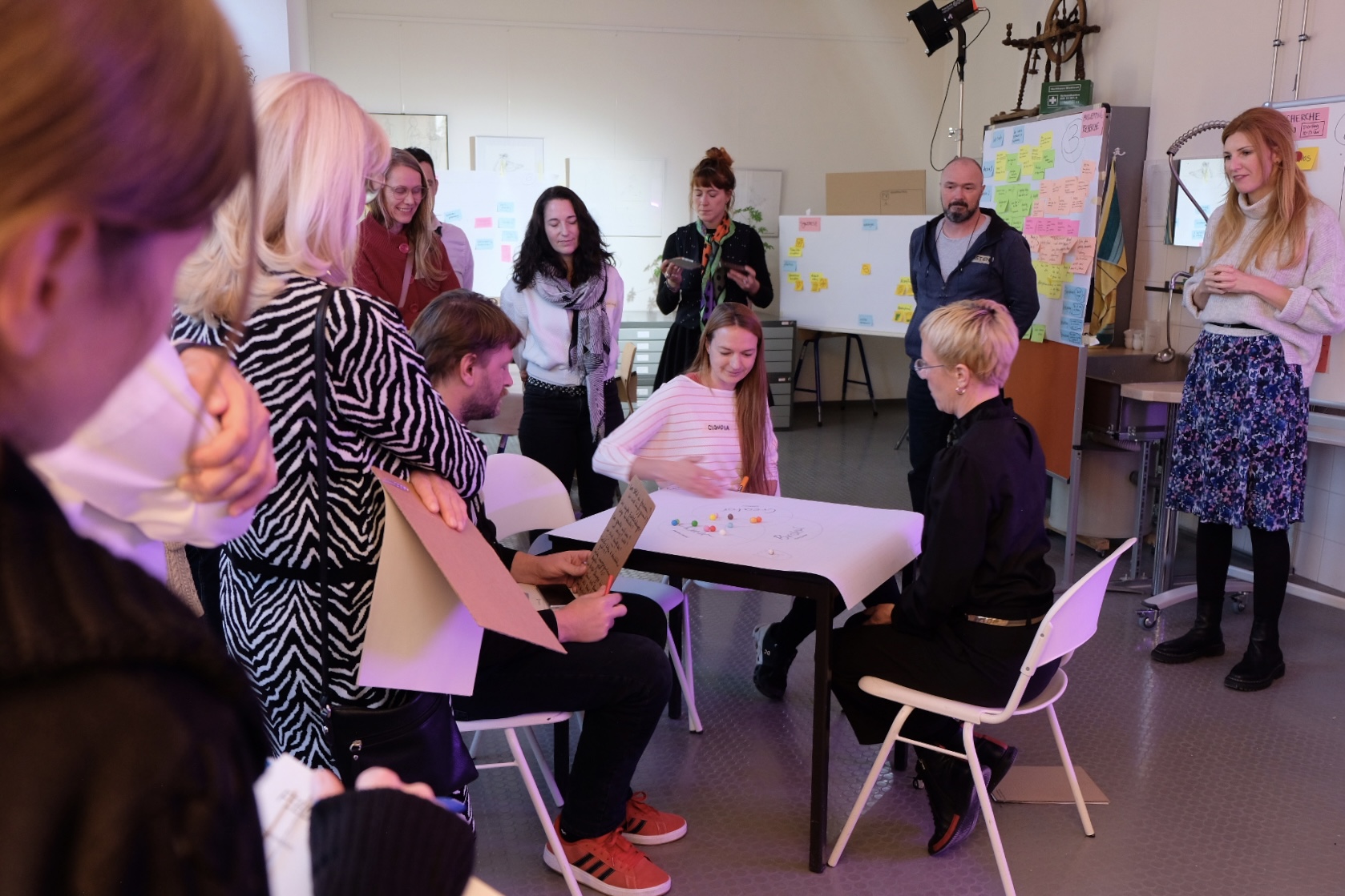 Für das Cross-Lab-Team “Top fit” bestehend aus Nachfolgerin Isabella Cardenas, Mitarbeiter Karsten Strickroth, Medienkünstlerin Franziska Burkhardt und Informationsdesignerin Claudia Zech, öffneten sich im fortschreitenden Prozess überraschend neue Blickwinkel auf unternehmensinterne Dynamiken. Durch Job-Shadowing, Interviews und systemische Aufstellungen bemerkte das Cross-Lab-Team, dass die von Transformation betroffenen Mitarbeitenden entgegen der ursprünglichen Annahme sehr wohl bereit sind, Veränderungen mitzutragen wenn sie sich im Transformationsprozess sicher fühlen. Das Team erkannte, dass die Basis für eine erfolgreiche zukunftsfähige Arbeit also an anderer Stelle implementiert werden muss und auch Übergebende und Nachfolgende eine entscheidende Rolle spielen. Der Mehrwert des Cross Labs zeigte sich damit vor allem, frei nach dem Motto “Der Weg ist das Ziel”, im Prozess selbst. Neue Blickwinkel legten Herausforderungen an unerwarteter Stelle frei. Mit Blick auf diese hat sich das Team eine Eventreihe überlegt, die alle im Unternehmen einbindet und eine Brücke von der Wertschätzung der Vergangenheit hin zum Blick auf die Zukunft schlägt. Konzipiert wurde zum Beispiel eine Weihnachtsfeier zur Gründungsgeschichte des Unternehmens im Märchenformat.