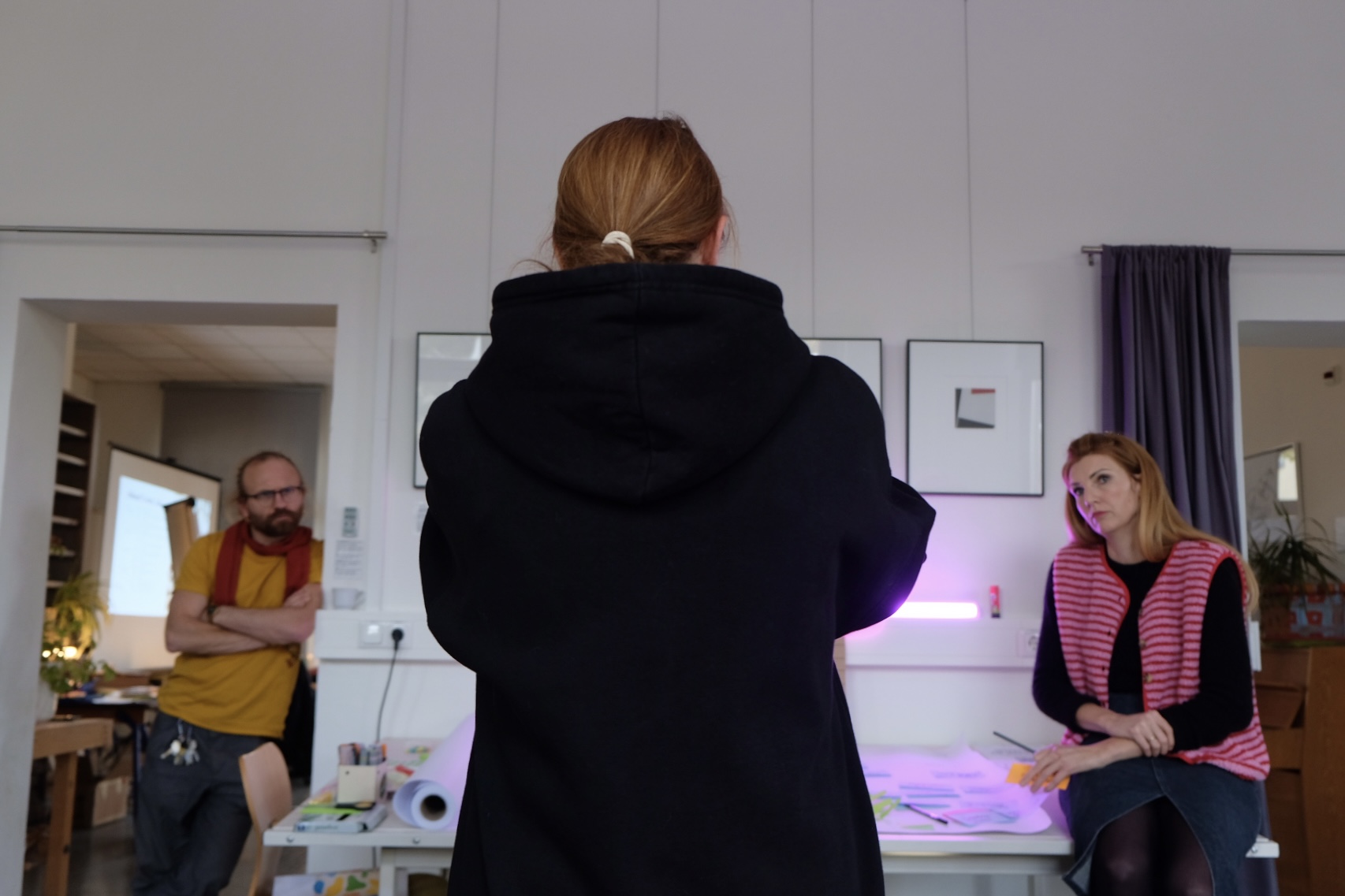 Im Case „Unternehmensnachfolge“ blicken wir über die Schulter des Teams rund um Nachfolgerin Isabella Cardenas, Mitarbeiter Karsten Strickroth, Medienkünstlerin Franziska Burkhardt und Informationsdesignerin Claudia Zech.