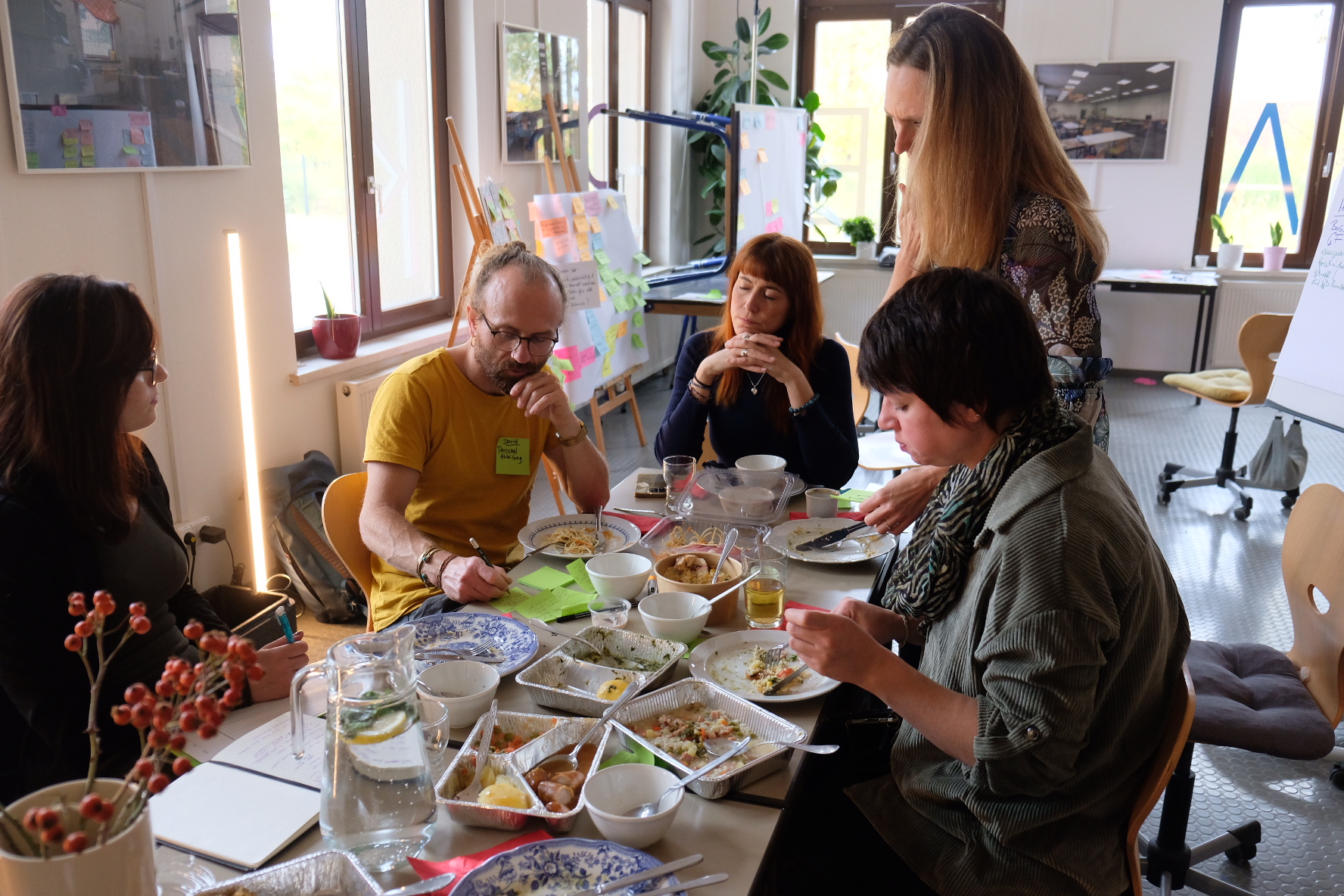Für das Cross-Lab-Team rund um Menü Mobil Geschäftsführerin Daniela Hühn und die Marketingsverantwortliche Viviane Steinkopf, Designer Nils Volkmann (Rugwind) und Porzellandesignerin Claudia Bock wurde nach einer ersten Auseinandersetzung mit dem Unternehmen schnell klar, dass es sich im Cross Lab auf das neugeschaffene Geschäftsmodell von Menü Mobil konzentrieren möchten: die Mittagsversorgung für die Pause im Büro von Thüringer Unternehmen. Dieser neue Geschäftszweig bietet Menü Mobil die Möglichkeit, geringere Margen bei Essenslieferungen im sozialen Bereich abzufedern. Wie kann man dieses Angebot also der potentiellen neuen Kundschaft schmackhaft machen? Anfangs hatte das Team den Gedanken, die Regionalität der Zutaten herauszustellen. Im Interview mit der möglichen Zielgruppe, also Menschen, die Mittagsangebote wahrnehmen, erhielt es jedoch eine überraschende Einsicht: den meisten Menschen ist die Herkunft der Zutaten ihrer gekauften Mittagsmahlzeit fast egal, aber nicht, wer sie gekocht hat. Die Befragten wurden weiterhin gefragt, was eine Mahlzeit für sie besonders macht. Die Antwort: das gemeinsame Verzehren mit anderen Menschen. Das Mittagessen ist also ein emotionales Momentum zwischen Menschen, die gemeinsam essen und denen, die das Essen zubereiten.